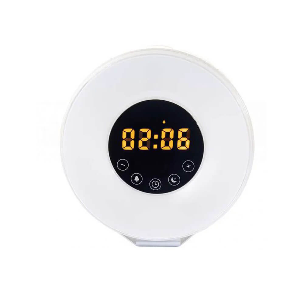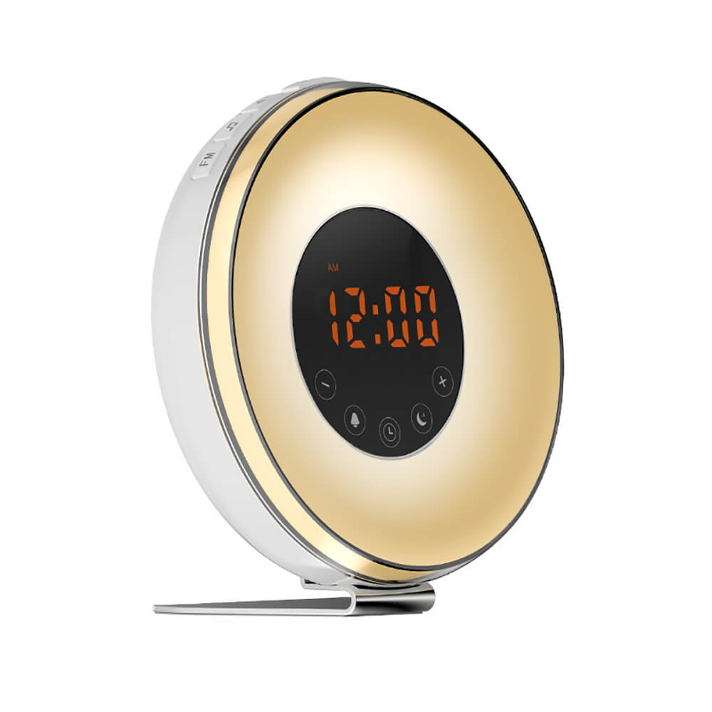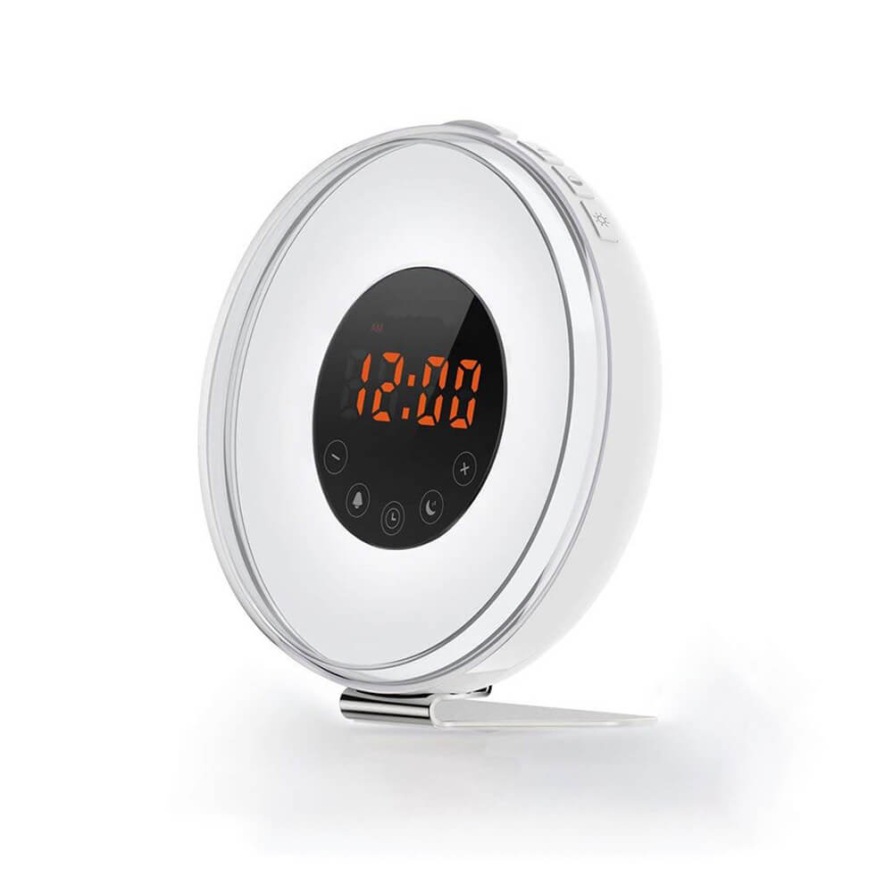 Будильник с имитацией рассвета Galo настольный делает просыпание в зимнее время более комфортным. Стильный минималистичный аксессуар впишется в любой дизайн. За эффект рассвета и солнечных лучей отвечает круговая подсветка вокруг циферблата, состоящая из 36 цветных и теплых белых светодиодов. Внутри электронный световой будильник показывает точное время, там же расположено сенсорное меню управления. Будильник электронный также поддерживает 6 звуковых сигналов либо сигналов с радио. Цифровой будильник с имитацией рассвета может работать от сети или от USB кабеля, получая питание от компьютера, повербанка.