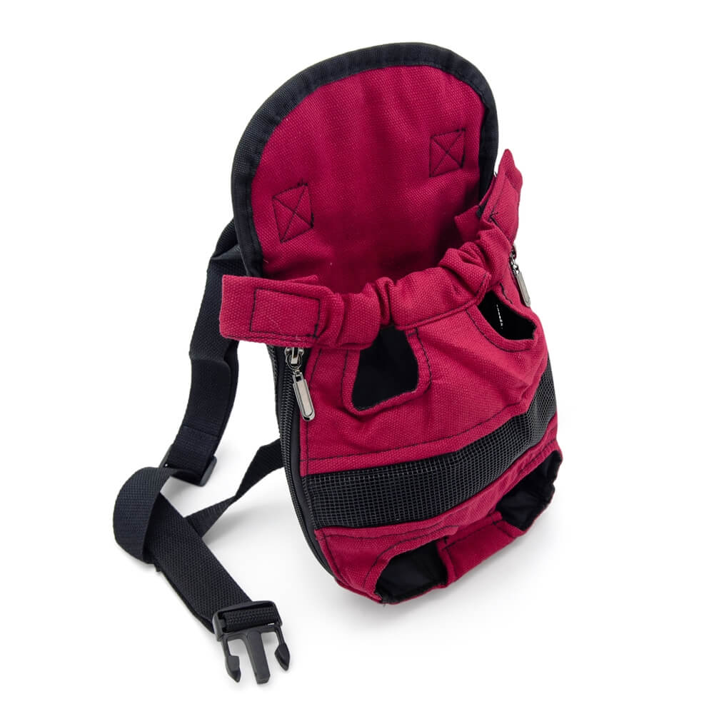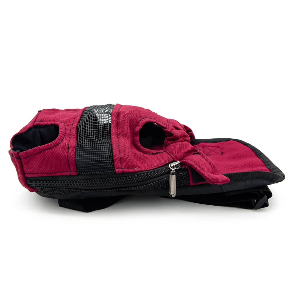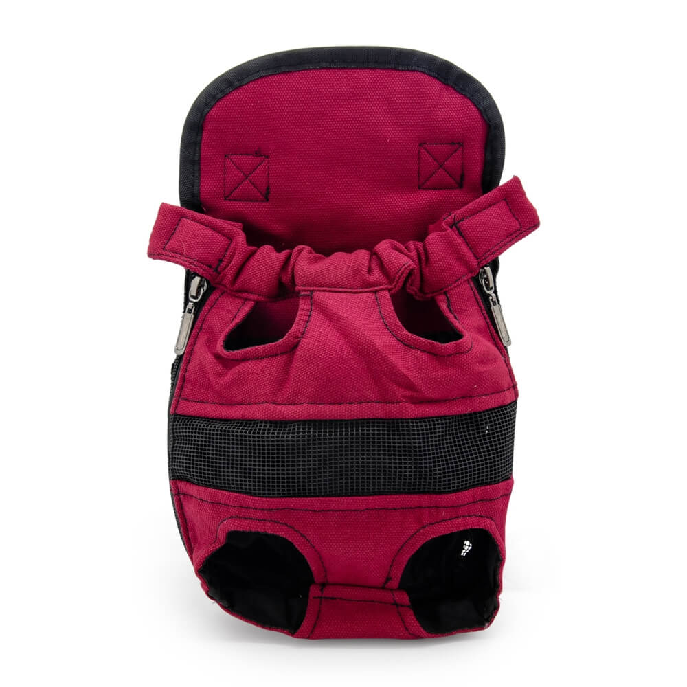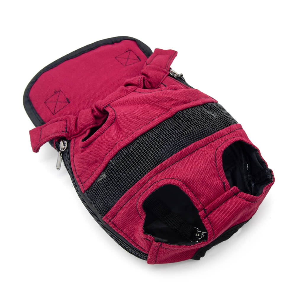 Рюкзак для переноски собак весом до 9,5 кг. Выполнен из нейлоновой ткани розового цвета с черными вставками. Внизу и в верхней части рюкзака имеются отверстия для лап животного.