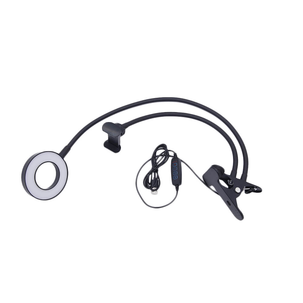 Гибкий портативный светильник для съемок на смартфон. Прибор представляет собой кольцевую безбликовую лампу на светодиодах, предназначенную для улучшения качества видео и фото съемки на улице и внутри помещения. Устройство удерживается специальной прищепкой и оснащено зажимом для смартфона. Для подключения к последнему предусмотрен разъем micro USB. Переключатель на проводе позволяет выбирать различные режимы освещения и яркость. Мощность лампы 5 Вт.